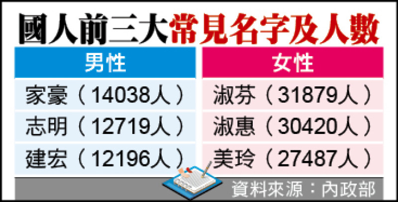 此外,國人前三大常見名字,男性依序為家豪(一萬四○三八人)、志明(一萬二七一九人)、建宏(一萬二一九六人);女性依序為淑芬(三萬一八七九人)、淑惠(三萬○四二○人)、美玲(兩萬七四八七人)。「家豪」自二○一二年起、「淑芬」自二○一○年起連續奪得第一。