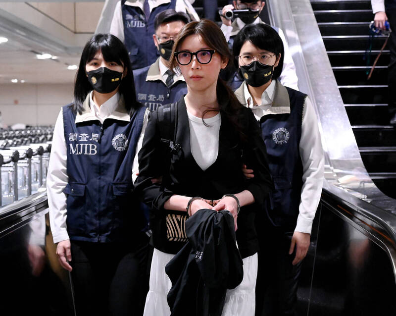 貴婦奈奈結束7年逃亡 清晨抵台狼狽被上銬媒體大陣仗直擊涉嫌吸金近兩億元潛逃加拿大六年多的網紅貴婦奈奈(本名蘇陳端),1日清晨5時許由調查局駐加法務秘書陪同搭機返抵桃園機場,調查局台北市調處人員在登機門口接押,隨後帶往台北市調查處詢問。(記者朱沛雄攝)