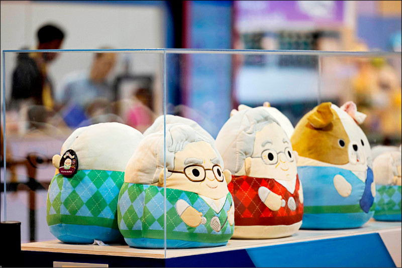因美國總統川普提高進口關稅,波克夏旗下的消費品事業包括Jazwares等遭到打擊,第二季營業利益下跌4%。圖為今年5月波克夏海瑟威股東會時,在Jazwares攤位上所展售的巴菲特肖像(左)毛絨玩具。(美聯社資料照)