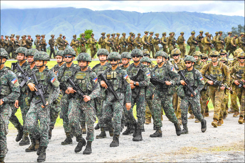 菲律賓武裝部隊和澳洲國防軍十四日至卅一日舉行兩國首次雙邊兩棲「波浪」演習,圖為參演士兵廿五日在菲國三描禮士省一處海軍基地行軍畫面。(法新社)