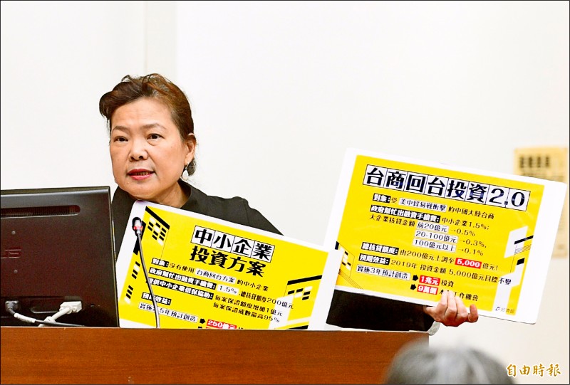 經濟部政務次長王美花昨赴立院財委會備詢,答詢時拿出看板說明蔡政府「中小企業投資方案」及「台商回台投資2.0」。(記者羅沛德攝)