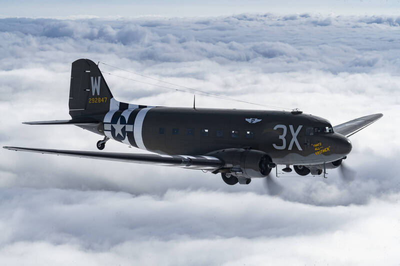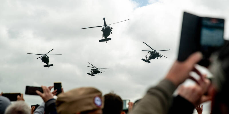 這架本月2日承載70餘名軍事迷、復刻法國卡倫坦鎮(Carentan)空降任務的C-47運輸機,在80年前的今天曾載運近13,000美軍傘兵空降參戰,是有實戰紀錄的老軍機。(截自美軍DVIDS網站)當年是美軍新銳空降主力的陸軍101空降師,在跳傘重演結束後,接續派出多架黑鷹直升機、「承先啟後」展示火力,讓民眾見識該師新世代的空中突擊能量。(截自美軍DVIDS網站)