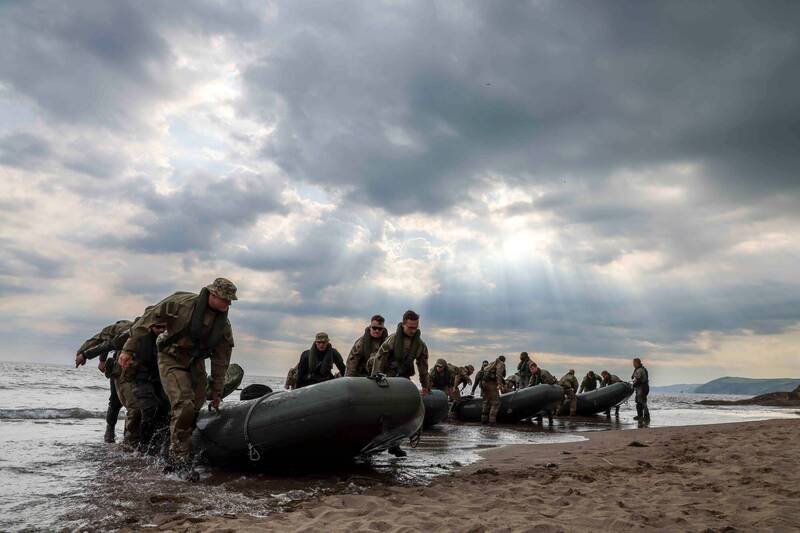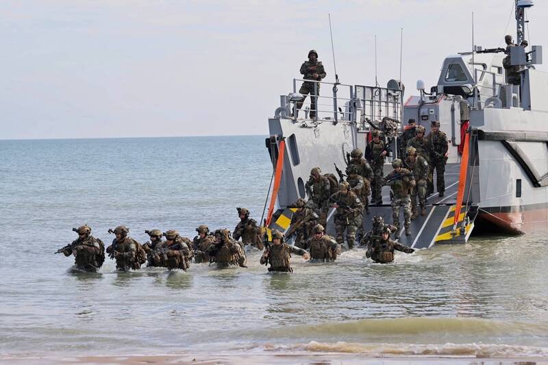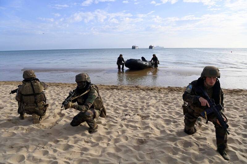 感念當年諾曼第登陸的歷史意義,英國皇家陸戰隊第47突擊隊(Royal Marine 47 Commando)上月循著前人的腳步,乘著氣墊艇進行兩棲登陸訓練。(截自英國國防部官方Facebook)法國海軍本月4日偕同美、加等國陸戰隊員,自美軍登陸艇踏上「奧馬哈」海灘(Omaha beach),合作重演美、法兩國當年的登陸行動。(截自法國海軍官方Facebook)法國海軍陸戰隊士兵踏上「奧馬哈」海灘(Omaha beach),復刻當年諾曼第D-Day搶灘景象。(截自法國海軍官方Facebook)