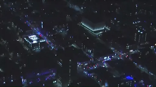 音頻加註文字,從航拍畫面所見,布朗大學一帶在槍擊案發生後被警察重重包圍。(本影片沒有聲音)布朗大學周邊居民被要求留在家中或遠離現場,直至解除避難令。