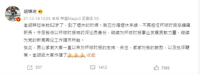 2016年2月14日,胡錫進在新浪微博發文:「中國還是應多放開言路,鼓勵、寬容建設性批評,對非建設性批評也應有一定承受力。言路寬鬆會導致一些問題,但它帶來的好處更多些。新中國的歷史證明,言路寬鬆與社會活力的關係密不可分;而對於它導致的問題,國家的應對能力是寬裕的。希望政府各部門、各級和各地官員都能為實現言路更寬做出自己貢獻。」 [21]。