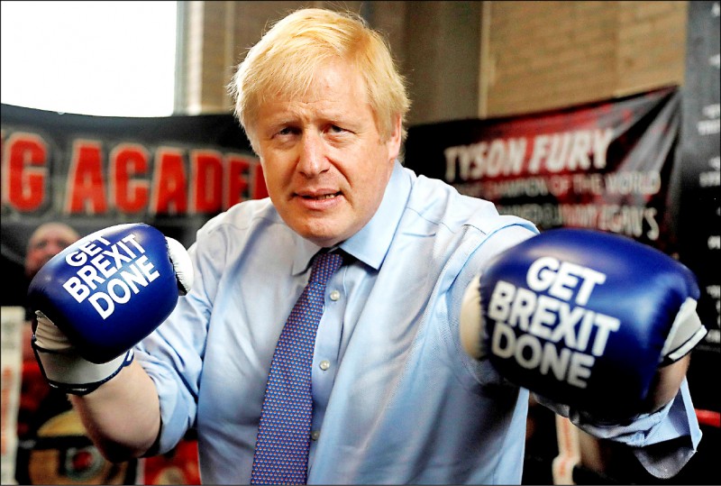 英國首相強森打算大幅改革叛國法,以因應中國與俄羅斯構成的威脅。圖為強森去年十一月戴著寫有「搞定脫歐」字樣的拳擊手套供媒體拍照。