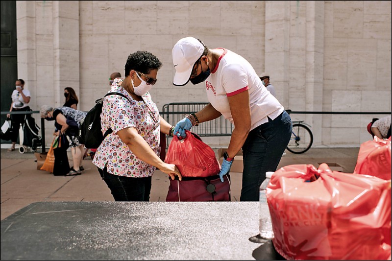美國武肺疫情持續高燒,重創經濟;圖為紐約市食物銀行在街頭發放救濟品給生活困頓的市民。(法新社)