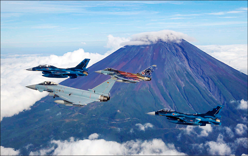 日本政府研究自二○二三年度起的五年間增加國防預算。圖為日本航空自衛隊F-2戰鬥機和德國空軍「歐洲戰機」九月聯合訓練時飛越富士山上空。(法新社檔案照)