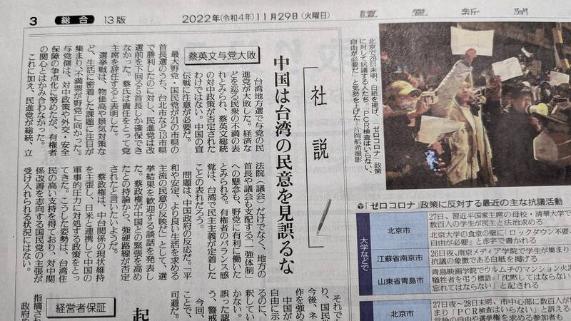〔駐日特派員林翠儀/東京29日報導〕對於民進黨在這次九合一選舉中大敗,日本媒體的解讀也在近日出爐,其中讀賣新聞今天以社論警告中國「不要曲解台灣民意」。社論中指出,台灣執政黨的敗選可以視為是民眾對經濟等問題的不滿,並非否定蔡英文總統的對中政策,並提醒大家有必要提防中國的宣傳戰。