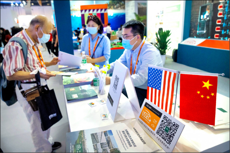 美國拜登政府二日證實將續延對中國進口商品課徵的懲罰性關稅,保留這項始於前朝川普政府的對中貿易戰的措施之一。圖為美國大豆出口協會去年9月在北京的中國國際服務貿易交易會的攤位上插著中美國旗。(美聯社)