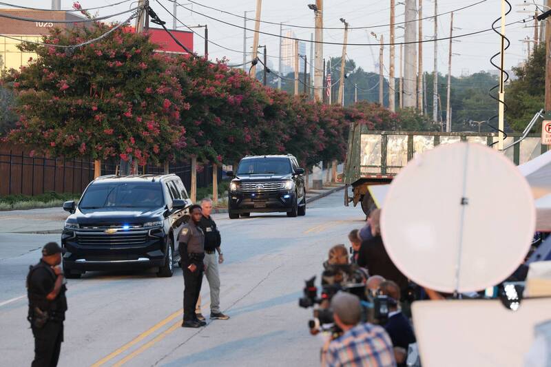 川普在美東時間24日晚間7時3分(台灣時間25日上午7時3分)抵達亞特蘭大的哈特斐德-傑克森機場,並由其車隊載往富爾頓郡監獄報到。(路透)