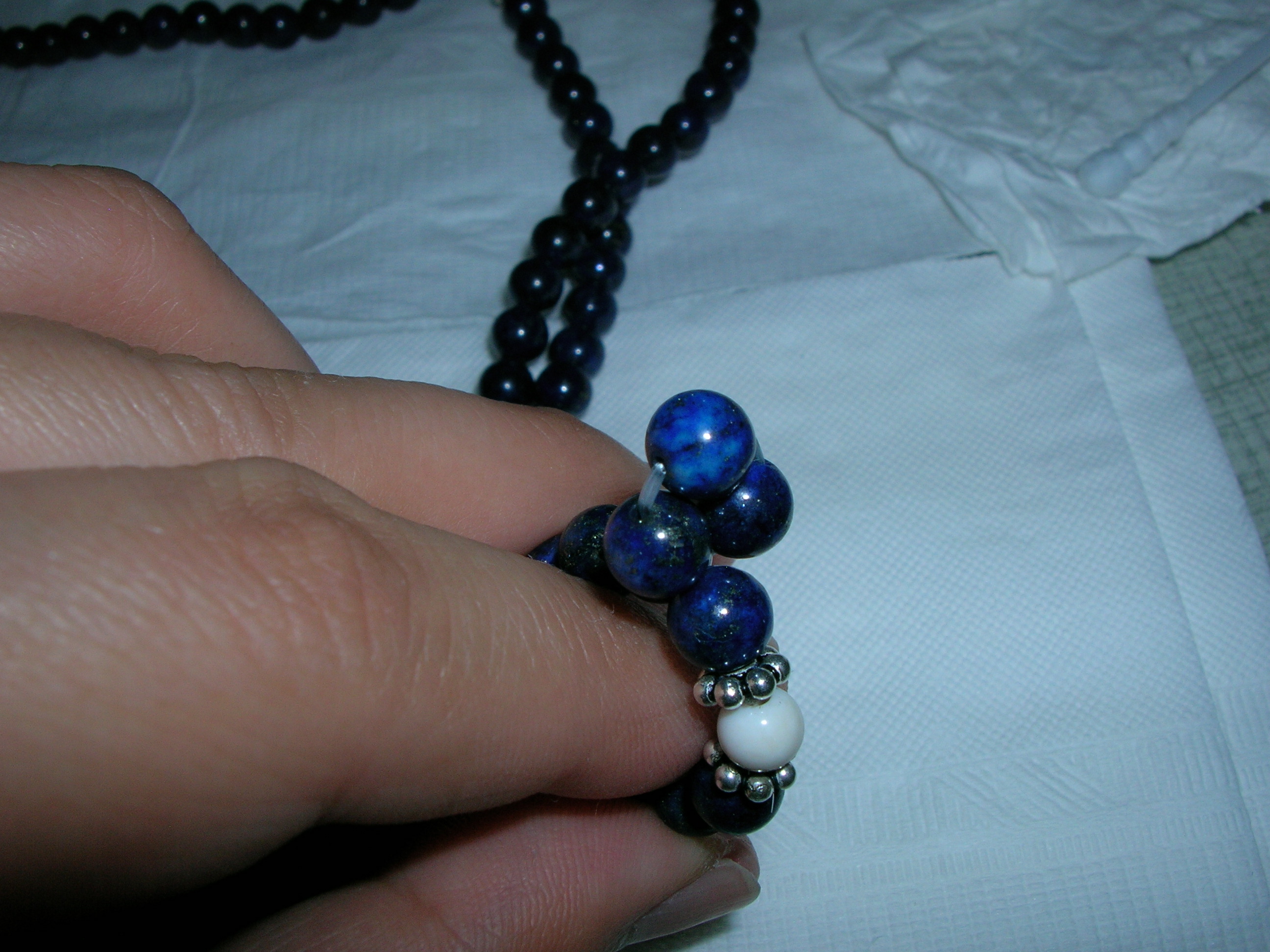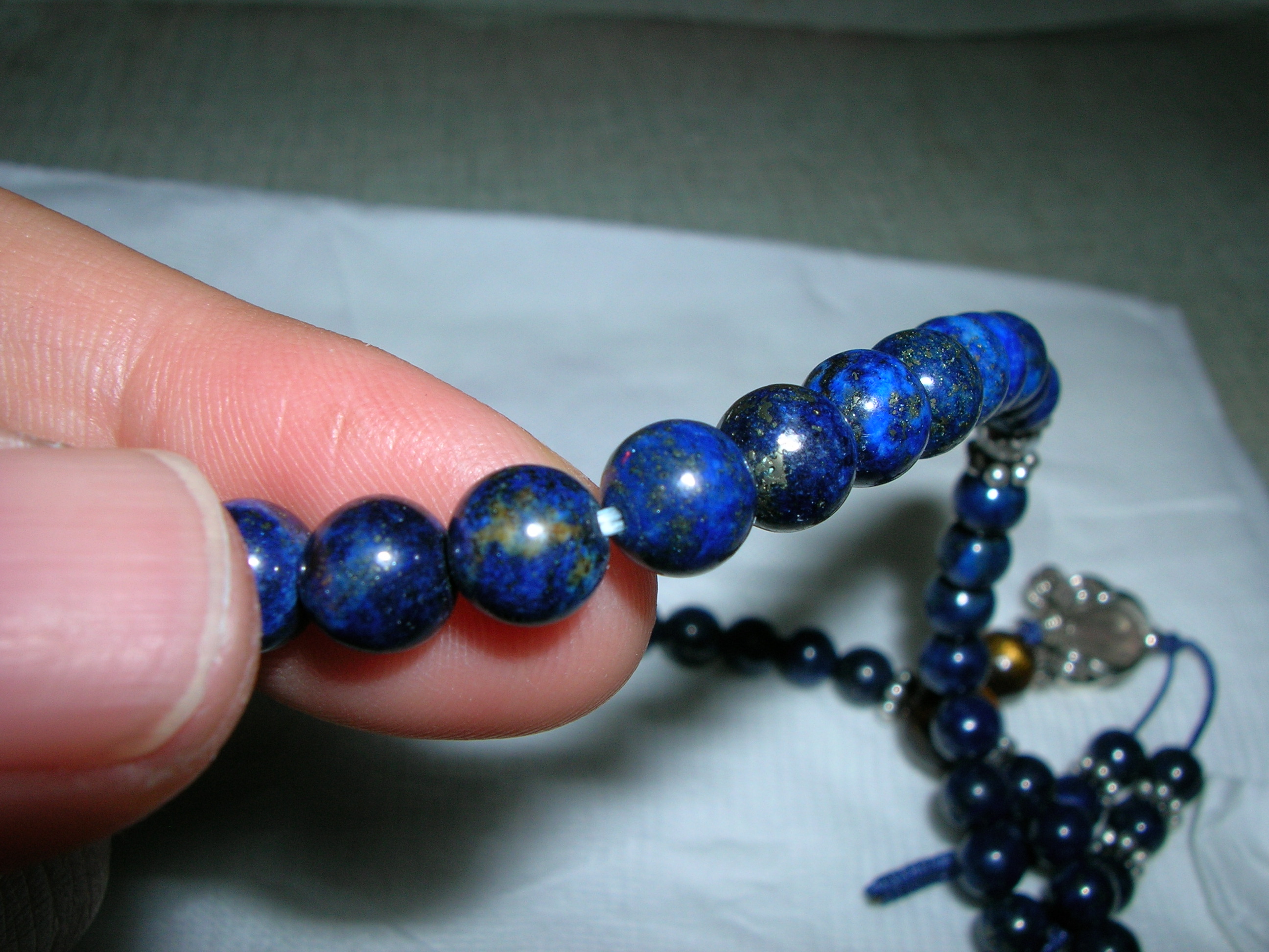 我有一串108顆念珠的青金石(上星期在網路上買的),昨天拿出來盤唸,卻發現左手 母指的指甲黑黑的,我就用酒精擦拭它,結果發現衛生紙上有淡淡的藍色,但過一下子顏色就慢慢不見了,然後我又用去光水擦拭,卻沒有顏色,對它也沒什麼感覺(我很少會對水晶有明顯的感覺,所以....{:soso_e127:})