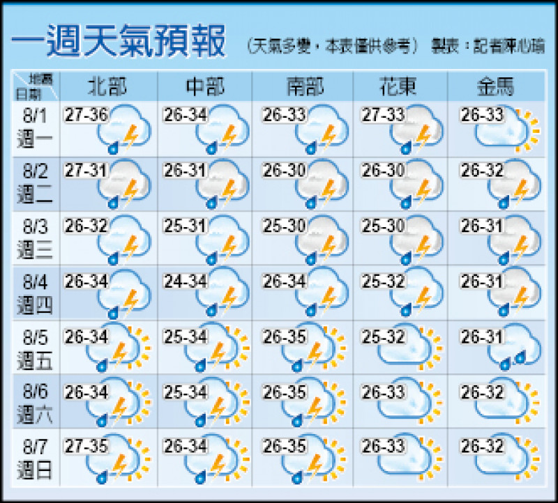 〔即時新聞/綜合報導〕中央大學大氣科學系兼任副教授吳德榮表示,今日各地區氣溫,北部23至34度,中部24至34度,南部23至35度,東部23至36度。下週四(8月4日)前慎防大雷雨,下週五(8月5日)天氣將好轉。