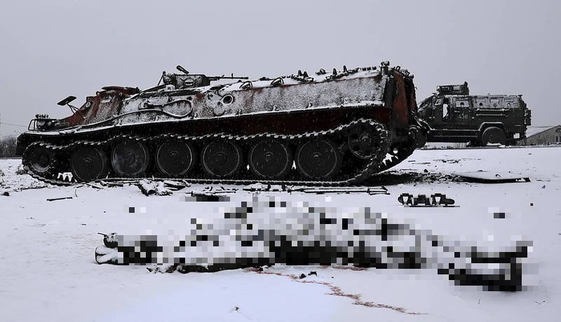 俄羅斯入侵烏克蘭據傳已有上萬名俄國士兵遭擊斃。圖為入侵烏克蘭的士兵,其遺體躺在被燒毀的俄羅斯裝甲運兵車旁邊。(歐新社)