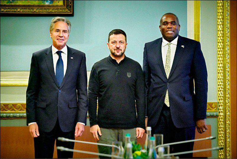 美國國務卿布林肯(左)、英國外交大臣拉米(右)11日在烏克蘭首都基輔與烏國總統澤倫斯基(中)會談。(歐新社)