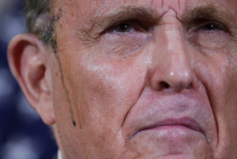 朱利安尼在19日90分鐘的記者會上,說得滿頭大汗,染髮劑從耳鬢流下。(路透)