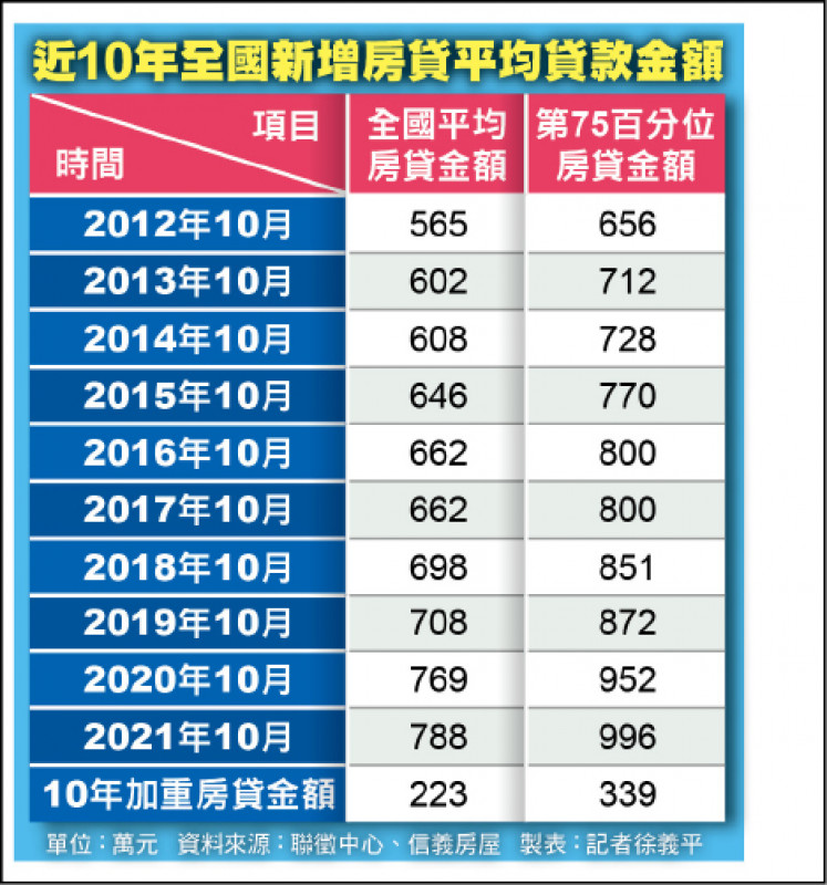 根據聯徵中心最新統計,去年十月平均房貸金額約七八八萬元,創統計以來新高,對比二○一七年十月的六六二萬元,五年來房貸金額平均加重一二六萬元,若再對照二○一二年十月的五六五萬元,十年來房貸金額加重二二三萬元。