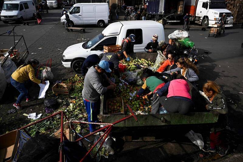 阿根廷經濟情勢嚴峻,民眾生活陷入困境,在超市丟棄的食物中找尋食材。(法新社)
