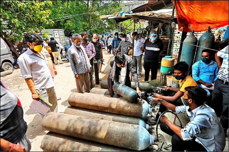 印度各大醫院紛傳氧氣供應嚴重不足。首都新德里的民眾為充灌氧氣筒而大排長龍。(美聯社)