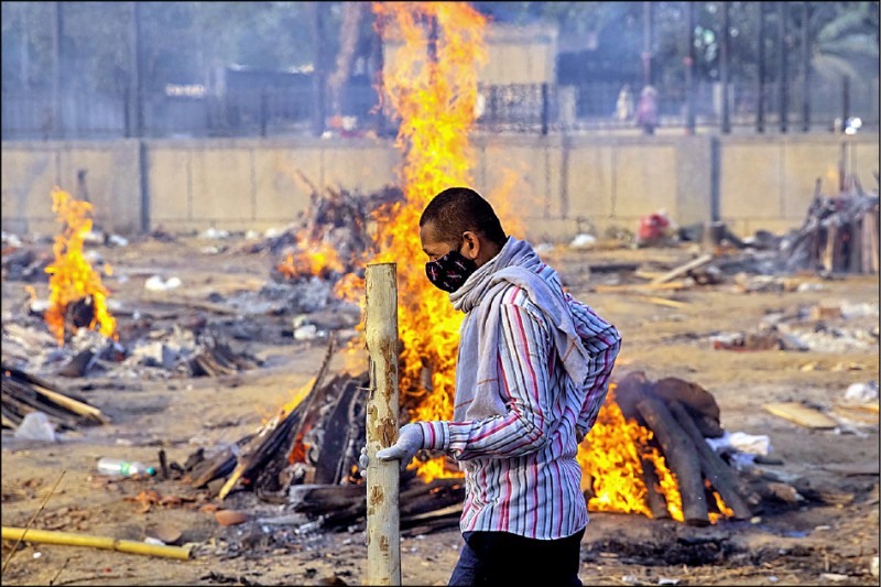 印度武漢肺炎第二波疫情凶猛,醫療系統瀕臨崩潰,染疫喪生民眾的遺體在火葬場就地火化。(路透)