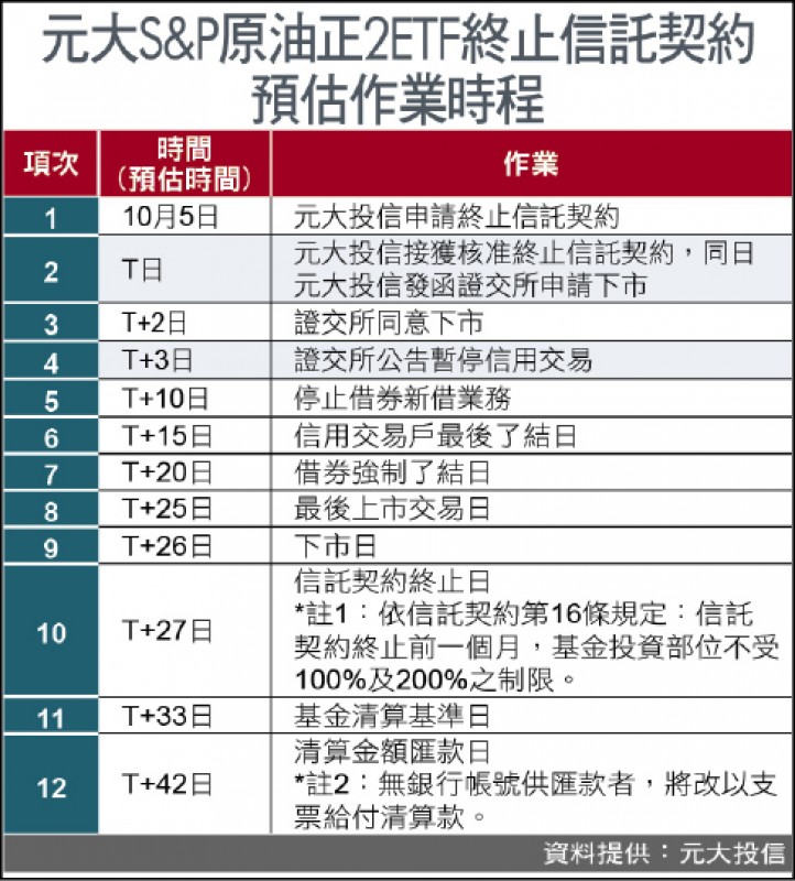 原油正 2 ETF 的平均單位淨值低於 2 元,將申請下市。元大投信估算,若以 8 月 19 日到 8 月 27 日七個營業日平均淨值 0.94 元計算,如果要讓 10 月第一個營業日 (10 月 5 日) 的近 30 個營業日平均淨值維持在 2 元以上,也就是說若想要免於下市,則 8 月 28 日至 9 月 30 日期間內,西德州輕原油期貨合約平均價格需達到 75 美元以上,才有可能免於終止信託契約。但是目前油價價格約在 43 美元左右,該檔 ETF 要達到免下市的門檻恐怕很難。