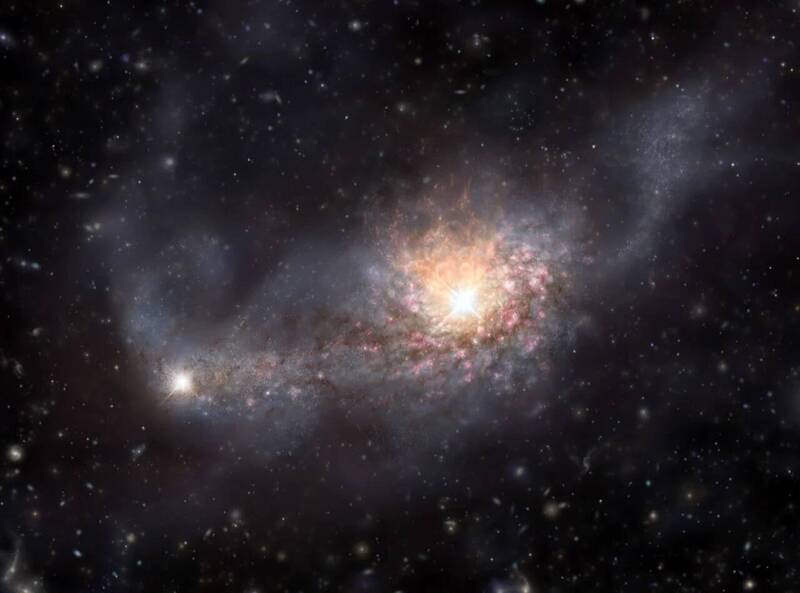 藝術家描繪了這項研究中觀察到的相互作用星系。合併過程中的引力相互作用,觸發了大量恒星在短時間内快速形成的星暴( starburst)現象和類星體活動。(取自ALMA專頁)