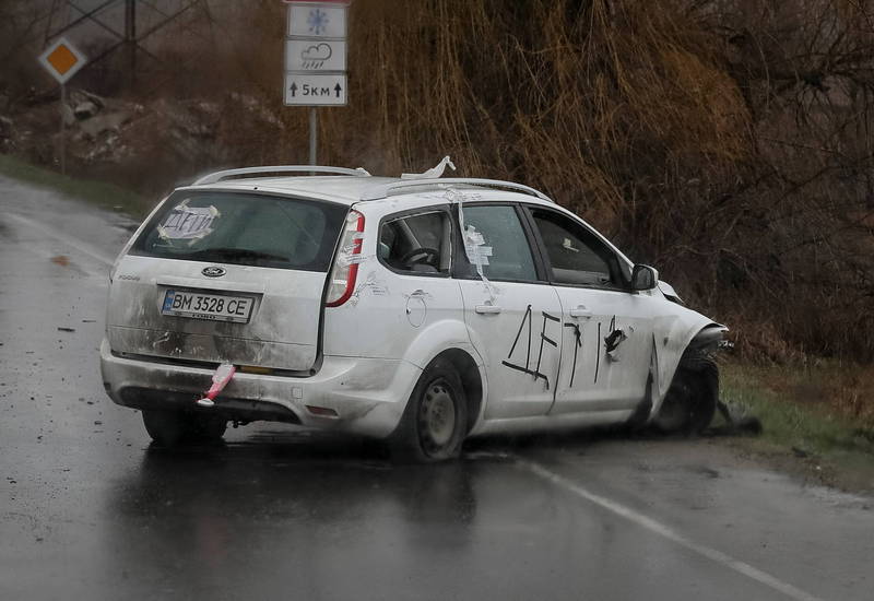 克里契科說,他看到一輛掛著白旗、車外寫著「(內有)孩童」的車子卻滿布彈孔,車內則留有血跡。(路透)