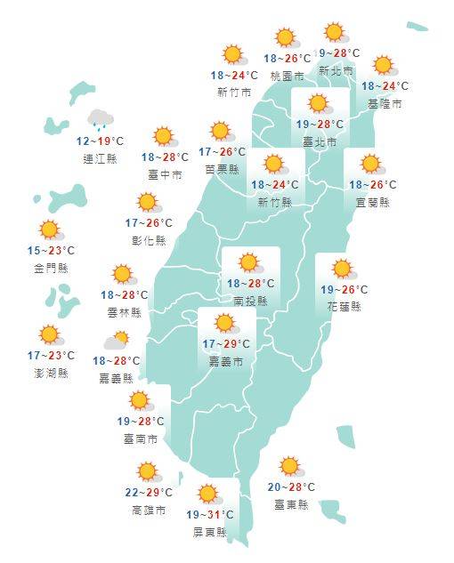 氣象局表示,今天僅東半部雲量較多,局部有零星降雨的機會,其他各地仍為晴到多雲的天氣,預估白天高溫全台為25、26度左右,南部會再更高一些,來到27、28度,然而到了晚上仍有輻射冷卻影響,中部以北及宜蘭花蓮為15至17度,南部及台東為18、19度,與白天相比溫度降幅大,尤其西半部地區要注意日夜溫差的變化,有10度左右的溫差。