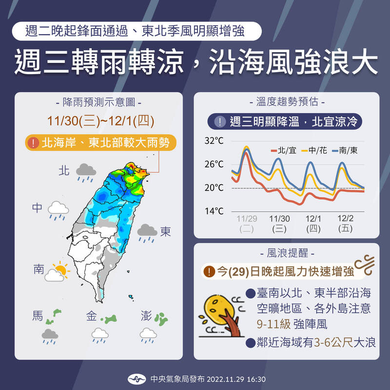 中央氣象局預報員張承傳說,今晚開始有一波入冬最強東北季風增強、有鋒面通過,北部越晚越有「變天」感受,除了風力變強,入夜後水氣增多,今晚開始到週五北部都會受到東北季風影響,感受濕涼、濕冷,北部、中部、宜花東明顯轉涼且有短暫雨,基隆北海岸、宜蘭地區更要留意局部較大雨勢。