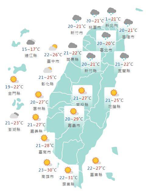 中央氣象局預報員趙竑說,今天中部以北整天偏涼,北部低溫約16至19度、中南部約19至20度,白天高溫僅約20至22度,中南部早晚感受較涼,白天高溫仍有26至30度。