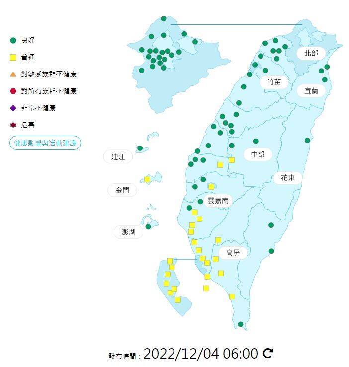 今日空氣品質方面,竹苗、中部、宜蘭、花東空品區為「良好」等級;北部、雲嘉南、高屏空品區及馬祖、金門、澎湖為「普通」等級。