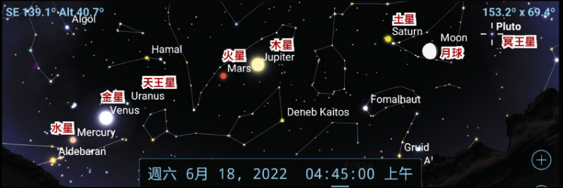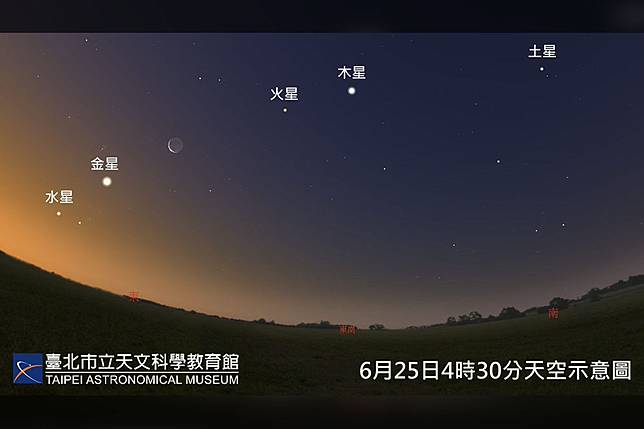 台北市立天文科學教育館表示,6月中旬到月底,肉眼可見的五顆行星:水星、金星、火星、木星和土星依序由下而上,從東北方低空到南方天空﹐在曙光前橫跨半個天幕排成一列,是能夠一次飽覽五星的難得機會,而19、20日黎明前則是這次「五星同現」的最佳觀賞時機。