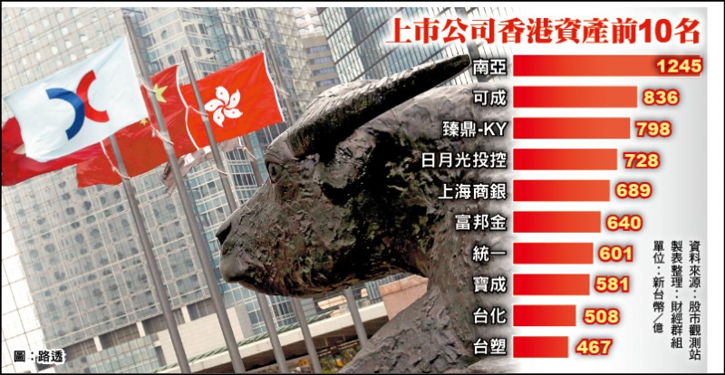 台塑集團是重押香港的台股最大咖,旗下三寶的南亞、台化及台塑合計香港子公司帳上投資餘額高達二二二○億元。其中南亞塑膠工業(香港)達一○三六億元,再依天眼查資料,這家是南亞轉投資十餘家中國子公司的控股樞紐,其原始投資金額僅四○七億元,停泊在香港未匯回獲利估逾六百億元;另台塑僅透過台塑開曼在港投資台塑香港,帳上資產高達四六七億元,相較原始投資的一五八億元,翻了數倍。