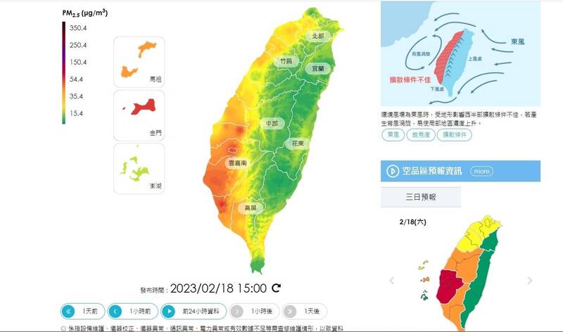 環保署監測,今(18)日環境風場為偏東風,西半部地區位背風側,水平風速較弱,且清晨垂直擴散條件差,混合層偏低,污染物易累積。至今下午3點,宜花東地區以及竹苗、中部山區、恆春、澎湖等地空品可維持綠色良好等級,其他地區空品都受影響。