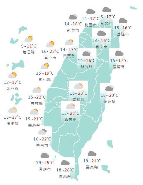 氣象局表示,清晨大陸冷氣團影響,高雄以北及宜蘭低溫約12到15度,花東及屏東16、17度,新北、竹、苗及金、馬仍有局部10度以下氣溫發生的機率,不過白天冷氣團減弱,氣溫逐漸回升,預測北部及宜、花高溫約18至21度,中南部及台東約22至25度,高屏內陸會再稍高一些,體感溫暖舒適;天氣方面,迎風面大台北及東半部地區整天仍有零星飄細雨的可能,其他地區為多雲到晴。
