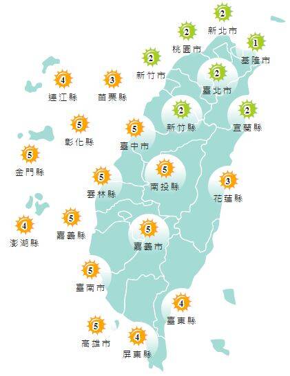 今日各地紫外線指數預報概況。(圖擷取自中央氣象局)