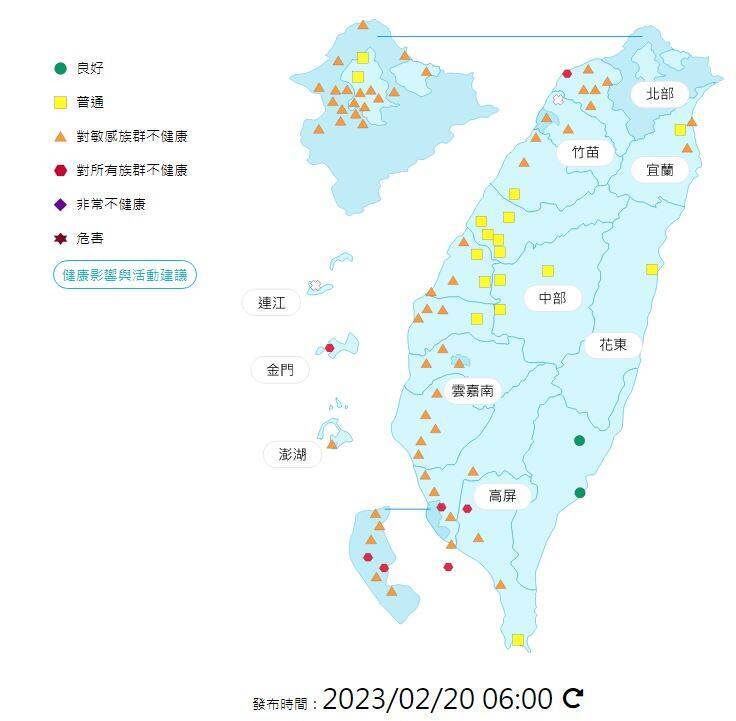 如北部到中部西半部沿海地區,空氣品質已呈現黃色普通等級,中部、高屏、馬祖等區則達橘色警示等級,雲嘉南更達紅色警示等級,依環保署空氣品質指標(AQI)說明,橘色警示已對敏感族群不健康,紅色警示則是對所有族群不健康。