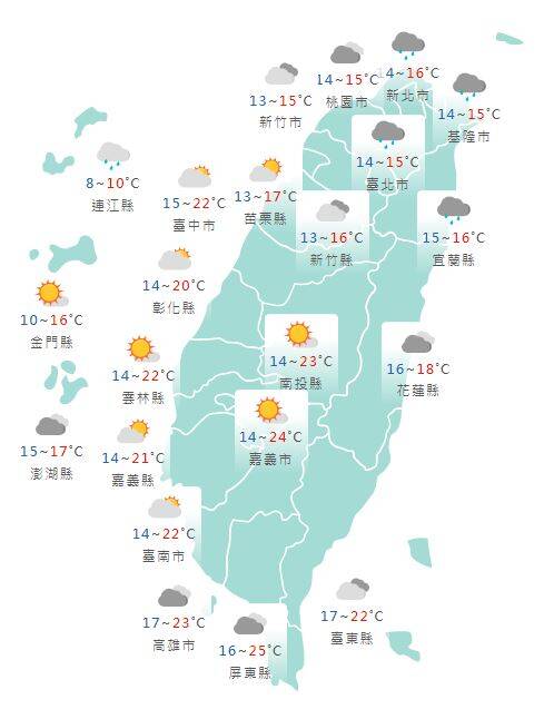 氣象局表示,白天北台灣高溫只有15度上下,花蓮雲量較多為18度,而其他地方則可以來到20至23度,高屏地區還會再更高一些。降雨方面,除了東半部之外,桃園以北降雨機率增加,其中基隆北海岸、大台北山區降雨較明顯,整日為陰雨的天氣,而新竹以南仍然為多雲到晴。