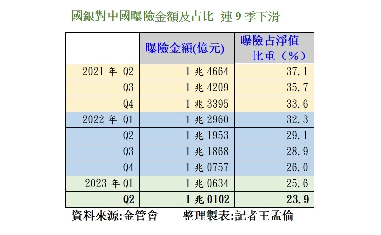 國銀對中國曝險金額今年第2季底為止,已經快跌破兆元關卡。(記者王孟倫製表)