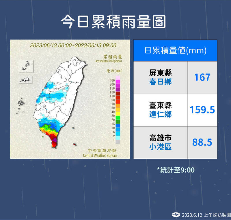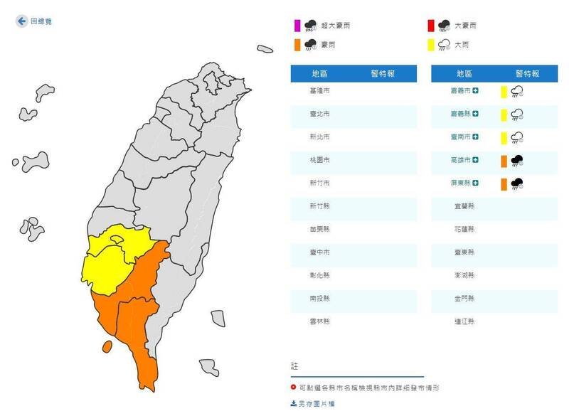 大雨特報有12個縣市:新竹縣山區、苗栗縣山區、台中市山區、南投縣、雲林縣、嘉義市、嘉義縣、台南市、高雄市、屏東縣、宜蘭縣山區、台東縣。