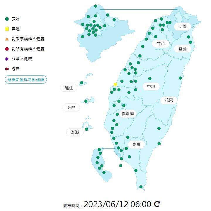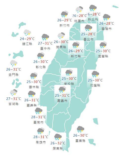 今日氣溫部分,各地沒下雨時仍然悶熱,高溫預測約28至32度,低溫約25至27度。空氣品質部分,竹苗、中部、雲嘉南、高屏、宜蘭、花東空品區及澎湖為「良好」等級,中部、雲嘉南零星地區短時間可能達普通等級;北部空品區及馬祖、金門為「普通」等級。