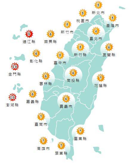 今日各地紫外線指數預報概況。(圖擷取自中央氣象局)